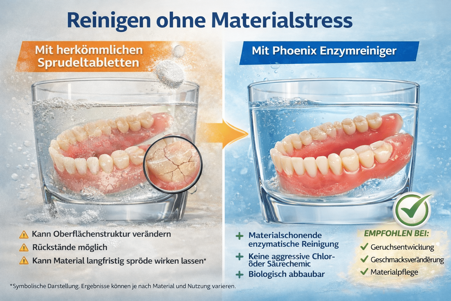 Wenn die Prothesenoberfläche durch aggressive Reiniger porös geworden ist, setzen sich Bakterien in den feinen Rillen fest und sind mit normaler Reinigung kaum noch erreichbar. Phoenix Enzymreiniger zersetzt diese Bakterien enzymatisch – ohne das Material weiter anzugreifen.