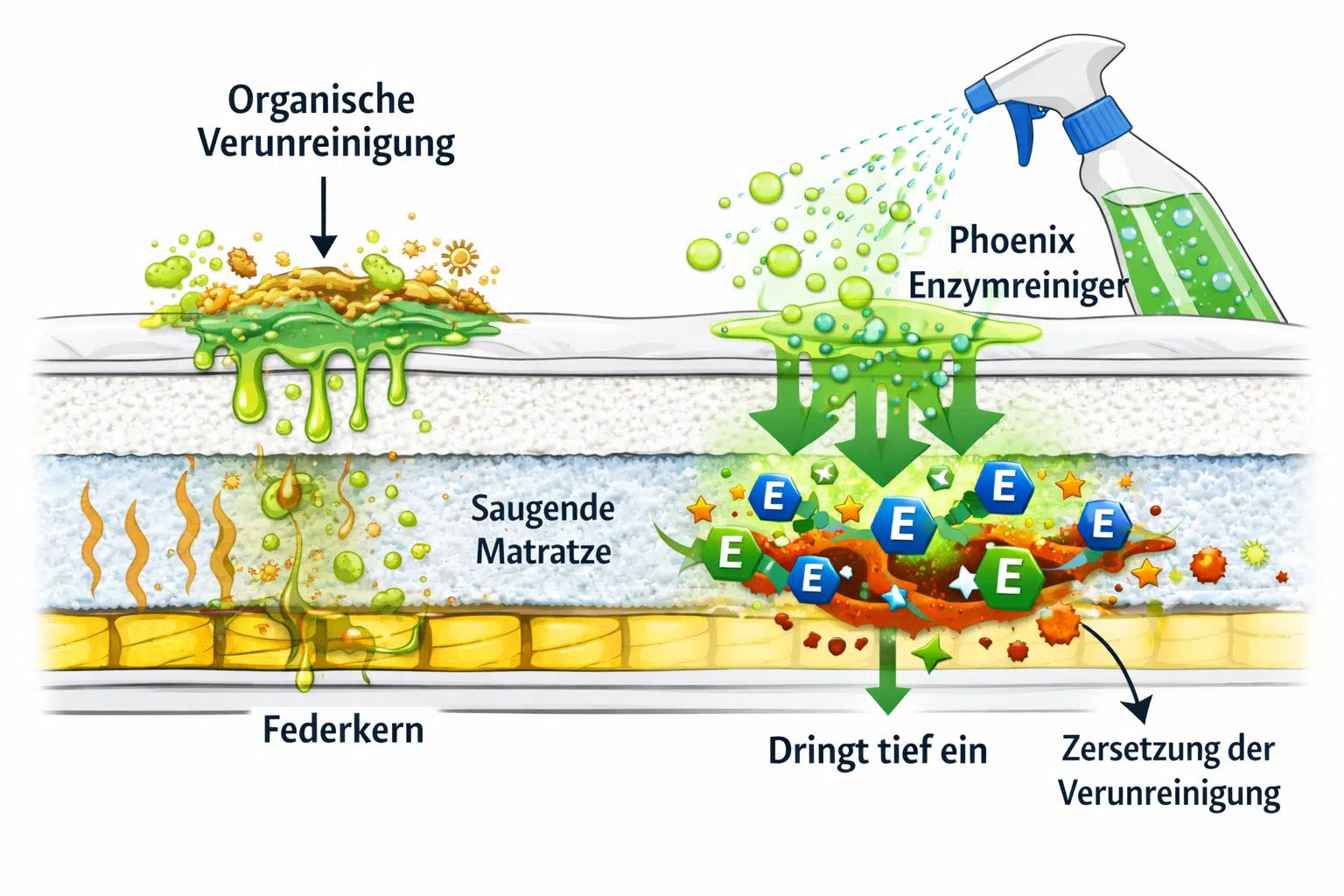 Weil Sprays und Reiniger nur die Oberfläche behandeln. Die organischen Verbindungen – Schweiß, Körperfette, Urin – sitzen tief im Polsterkern. Bei Wärme reaktivieren sie sich. Phoenix Enzyme bauen diese Verbindungen tief im Material auf – dauerhaft.