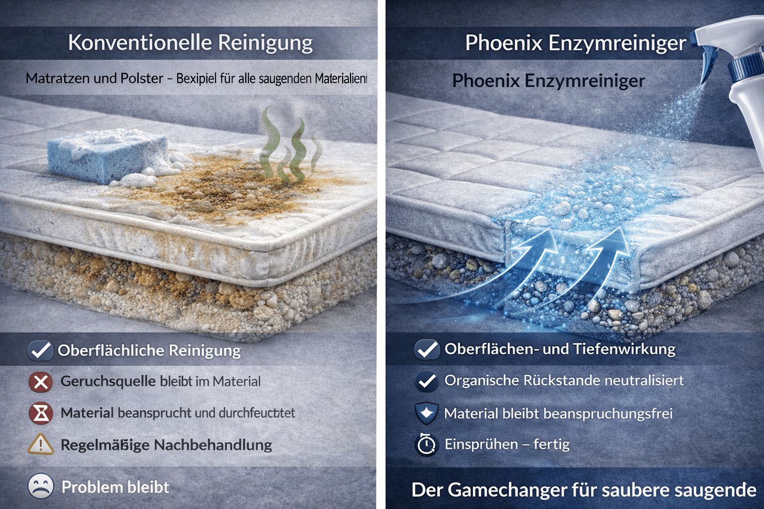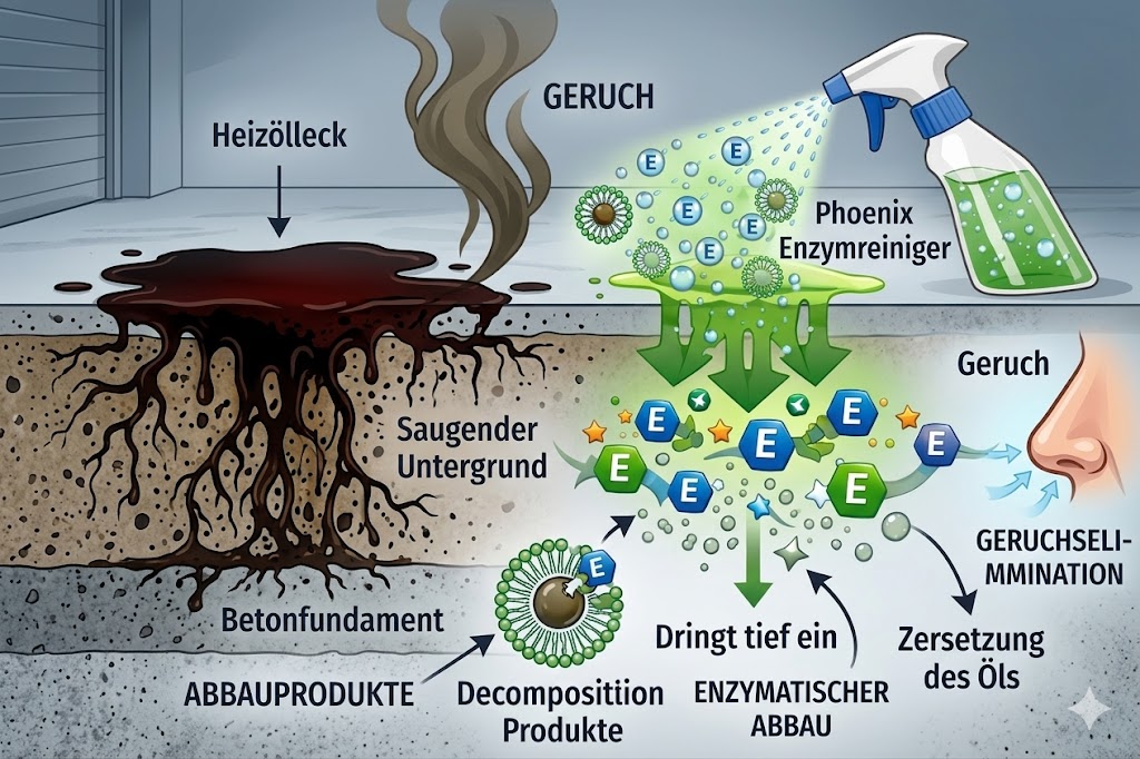 {"@type":"Question","name":"Funktioniert das auch bei Motoröl auf Beton?","acceptedAnswer":{"@type":"Answer","text":"Ja. Motorölflecken auf Beton, Garagenboden und Estrich werden enzymatisch gespalten."}},