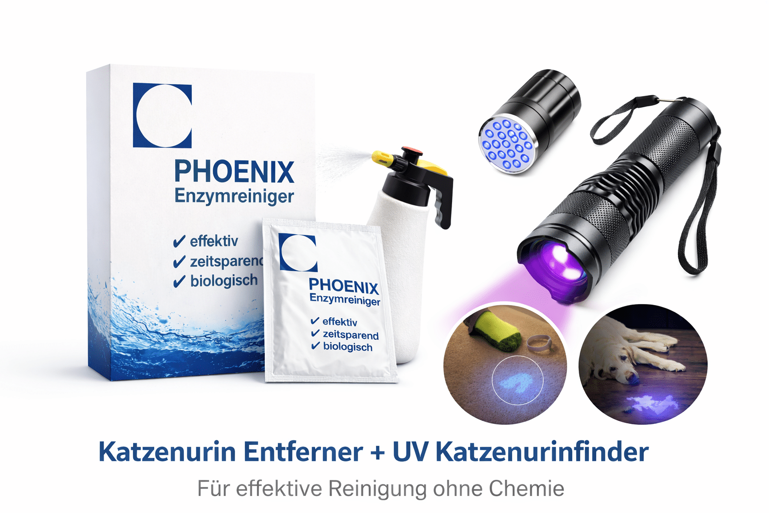 Der Phoenix Katzenurindetektor nutzt UV-Licht, um Urinspuren sichtbar zu machen – schnell, gezielt und zuverlässig. So wissen Sie genau, wo gereinigt werden muss, statt auf Verdacht zu putzen.