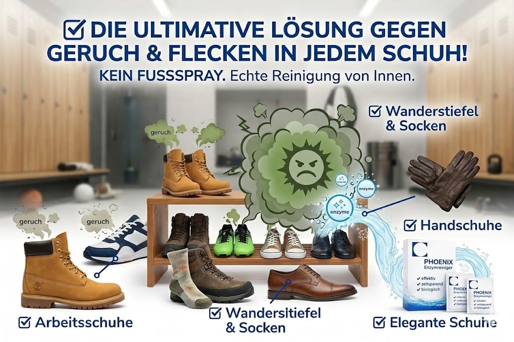 Sprühen sie dann das Material großzügig ein und lassen den Enzymreiniger die geruchsbildende Bakterie beseitigen. Sollte nach dem Trocknen noch unangenehmer Geruch auftreten bitte wiederholen. Sie können den Phoenix-Enzymreiniger Fußgeruch Schweißfuß auch zur Waschmaschine in den Waschgang geben. Bitte lesen Sie hierzu auch meinen Blogbeitrag Phoenix Maschinenreiniger. Unter dem Punkt Waschmaschine finden Sie nützliches zum Einsatz von Phoenix in Waschmaschinen.